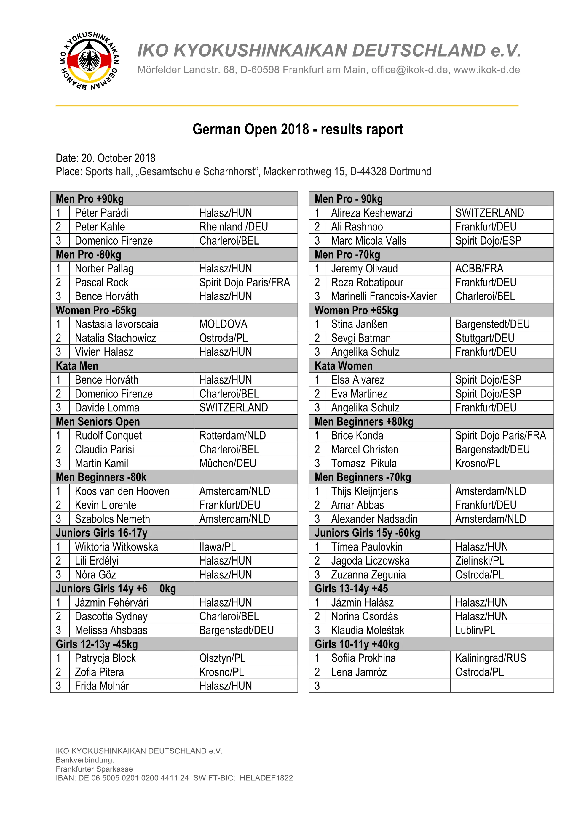 Am 20 Oktober 2018 wurden, nach einer 2 jährigen Pause, erneut die German Open ausgetragen. Veranstaltungsort war Dortmund und die Meisterschaften wurden durch das Dojo Scharnhorst organisiert. Es sind 150 Teilnehmer aus Belgien, Deutschland, Frankreich, Holland, Moldavien, Polen, Russland, Spanien, Ukraine, und Ungarn angetreten.